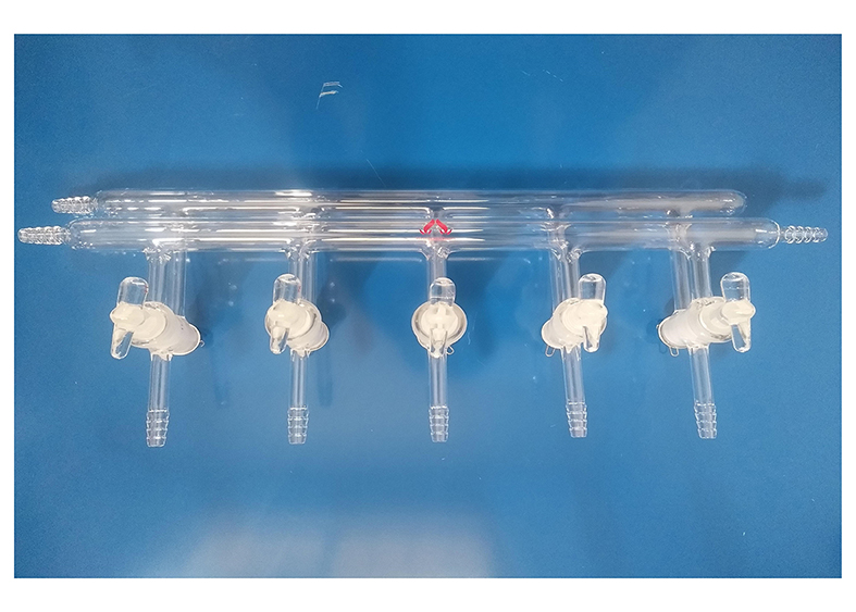 该型号双排管真空分配器为三通实心玻璃节门,配不锈钢弹簧及卡子,节门塞内有平行的双排导气孔。当节门旋转180°时可切换通气流向,两个管的外径是22mm,两个小咀(前管左侧后管右侧)的外径为10mm,每组出气小咀的外径为10mm,间距为75mm。