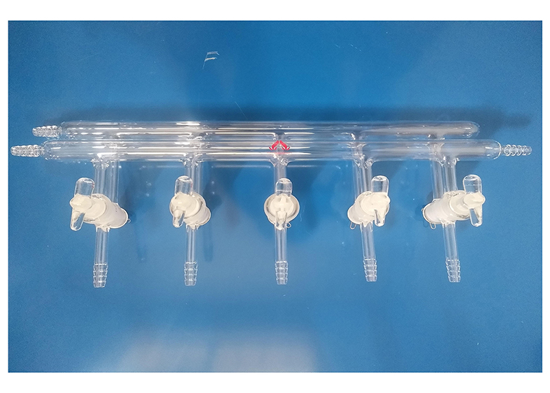 该型号双排管真空分配器为三通实心玻璃节门,配不锈钢弹簧及卡子,节门塞内有平行的双排导气孔。两个管的外径是22mm,每组出气小咀的外径为10mm,间距为75mm。主管上为两个10mm(外径)通气小咀。分别为前右,后左。