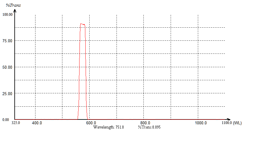 可见光带通滤光片,透过峰值波长575nm,半波带宽<20nmOD3M62螺纹,石英基底高温镀膜。