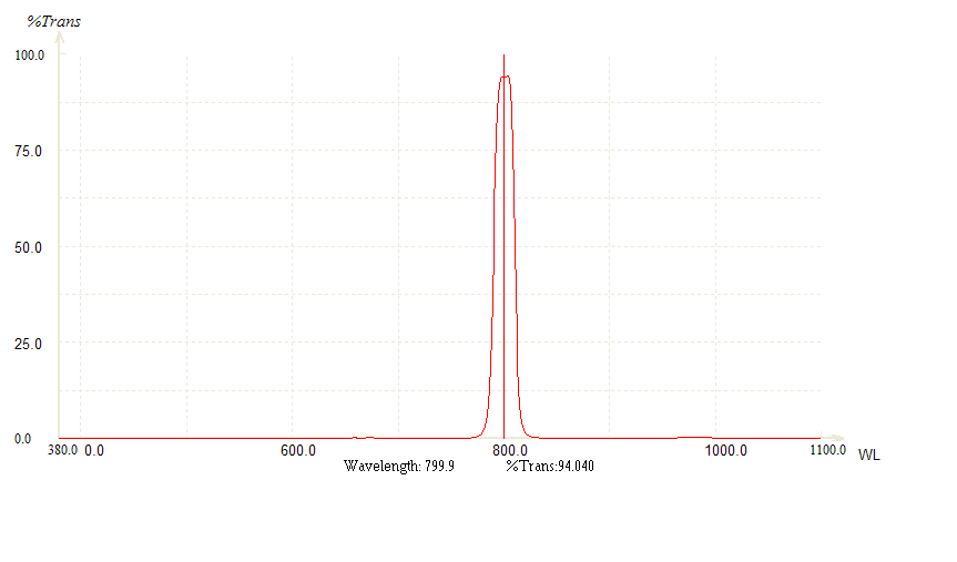 红外光带通滤光片,透过峰值波长800nm,半波带宽<20nmOD3M62螺纹,石英基底高温镀膜。