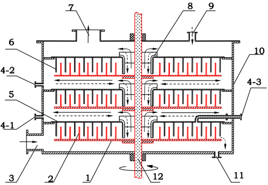 1-动盘; 2-动折流圈;3-气体进口管; 4-1,2,3-液体进口管; 5-静盘; 6-静折流圈;7-气体出口管; 8-导流管; 9-回流管;10-壳体; 11-液体出口管;12-转轴