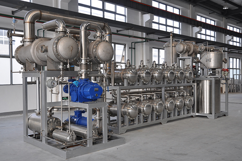 符合进膜要求原料通过原料泵进入预热器和蒸发器,达到一定温度后以蒸汽的形式进入膜分离机组,膜分离机组由多个膜组件串联构成。原料中的水分和少量有机物经膜组件由膜上游侧渗透至膜下游侧,膜上游侧最后一级得到成品。膜下游侧采用抽真空加冷凝的方式以形成膜上下游两侧组分的蒸汽分压差。渗透液蒸汽在真空机组抽吸下进入冷凝器。冷凝后的渗透液通过渗透液泵排出后回收处理。