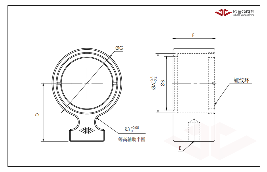 透镜固定架 元件外径 (A) Φ50/50.8mm 元件厚度 (T) 2~9mm 安装孔( E) M4