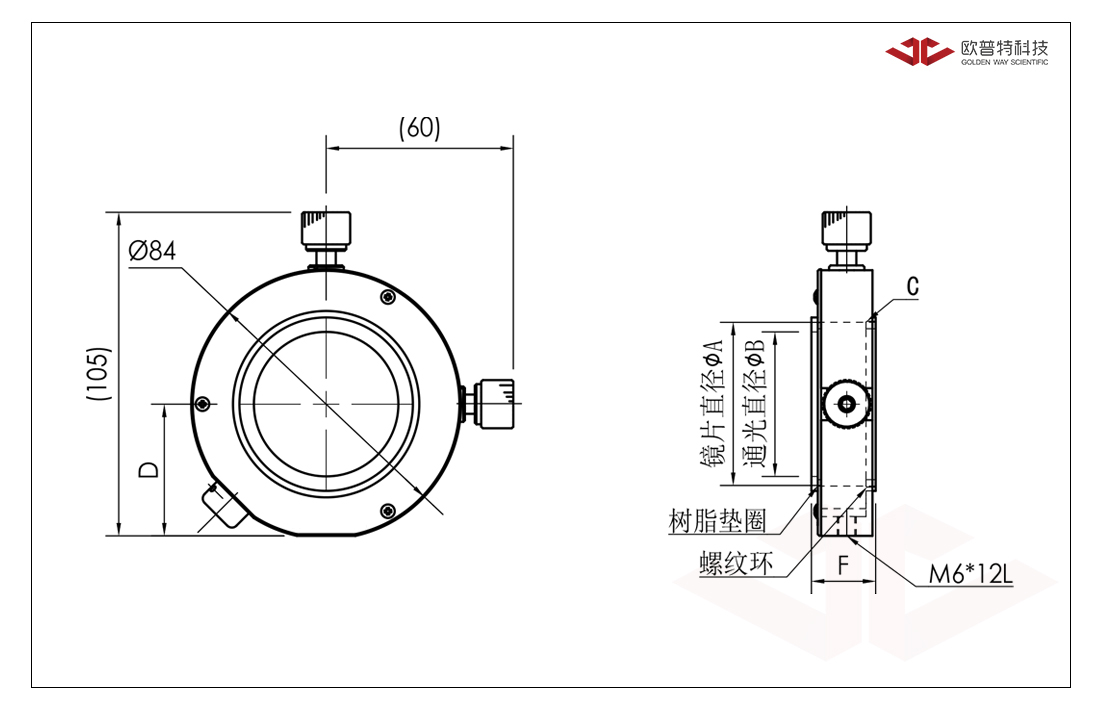 透镜固定架 元件外径 (A) Φ60mm 元件厚度 (T) 3~16mm 安装孔( E) M6