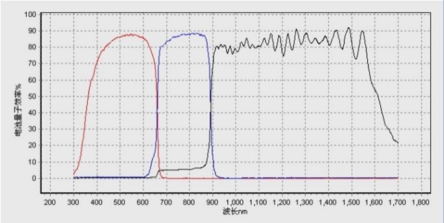 | 实测双结电池量子效率曲线 | 实测三结电池量子效率曲线 |