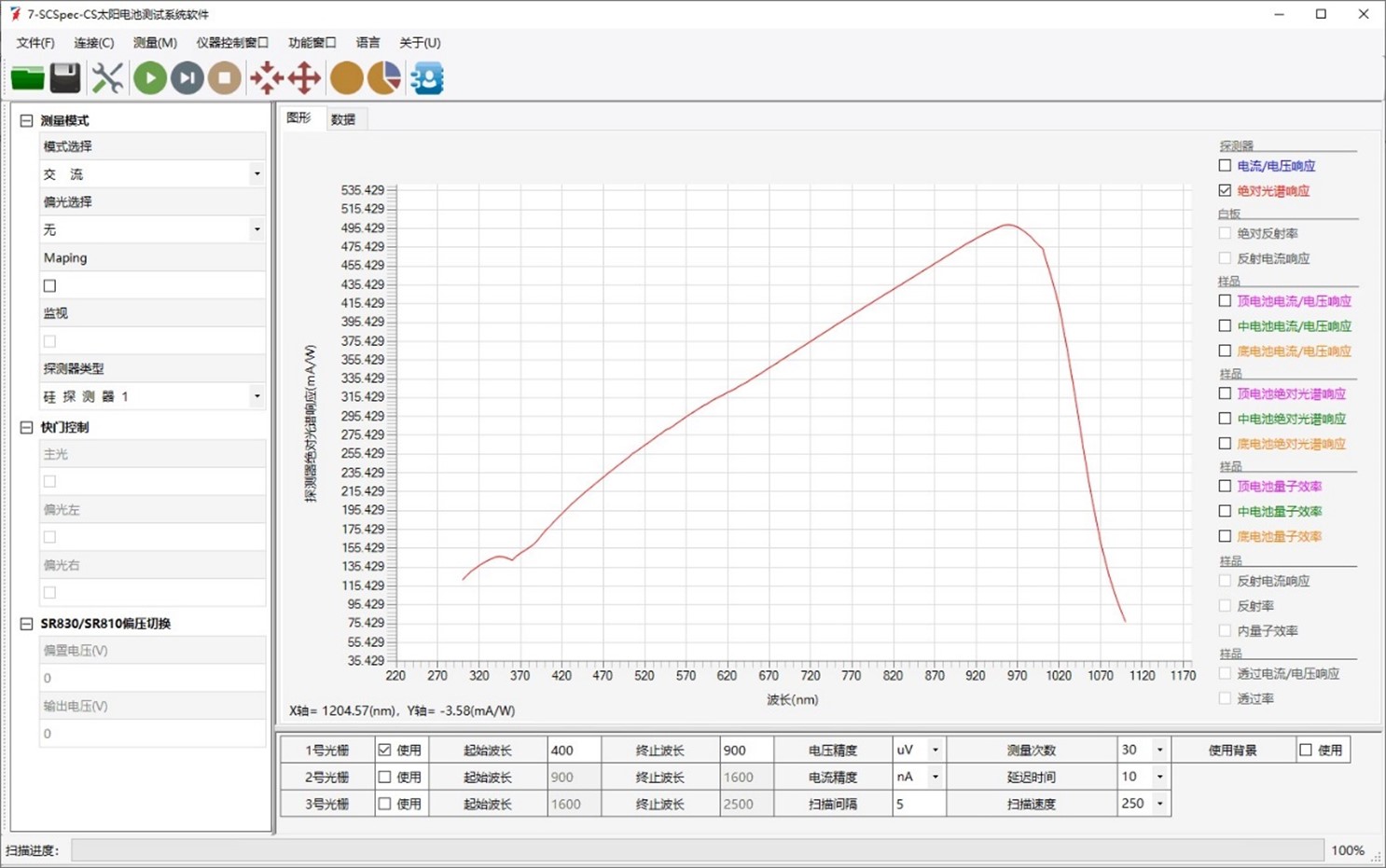 由我公司独立研发的SSC-QE-IPCE太阳能电池量子效率测试软件,用于对太阳能电池的内外量子效率测试、光谱响应测试、光谱透射率、光谱反射率、光电转换效率、短路电流密度等功能测量。软件将仪器控制和仪器参数设置汇总到不同界面,从而最大限度的将控制操作简化,功能实现一键运行。系统软件测试数据,支持图片和数据的导出和报表打印功能,以方便您使用其他数据处理软件调用,方便后续数据处理与分析
