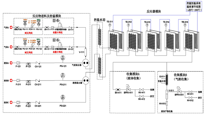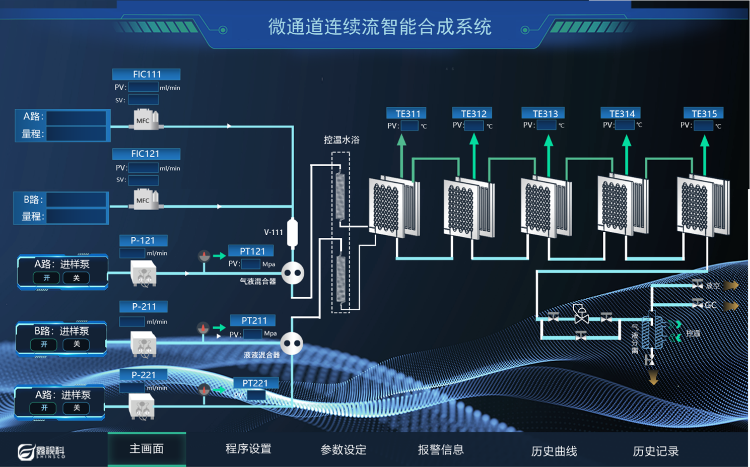 SSC-MCFR50微通道连续流智能合成系统是由进料系统、混合模块、预热模块、微通道反应模块、产物收集系统、温度控制采集、压力控制、阀门切换系统、PLC数据采集系统等组成,通过微通道混合器、微通道反应器、微通道换热器、管式反应器等实验需求的组合,实现反应进行的连续化、微型化、智能化。