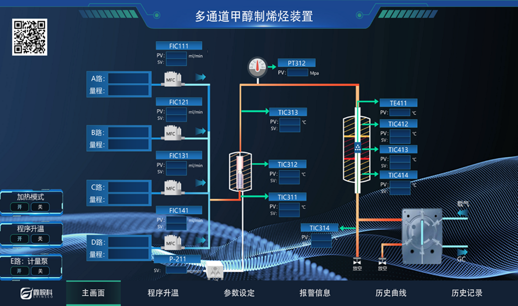 3) 系统采用PLC组态软件系统控制实验过程可实现手动/自动控制气体进料开、关和气体流速,控制可实现多段程序升温控。能实现实验数据手动/自动处理、采集和报告生成。在设备出现故障时设备具有弹窗功能并可点击弹窗放大,并伴有声光语音报警及时提示设备故障。