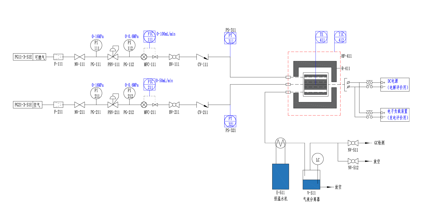 电化学测试模块(选配,一般由用户提供或采购) 1) 功能:测量SOEC的电压、电流、功率密度及电化学阻抗谱(EIS)。 2) 电化学工作站:支持恒电位、恒电流、EIS模式,电压范围±10 V,电流范围±2 A。 3)电流收集器:铂或镍网,确保低接触电阻。 4) 测试夹具:氧化铝陶瓷夹具,耐高温、绝缘性好。 5) I-V曲线:扫描电压(0.5–2.5 V),记录电流密度。 6)EIS:频率范围0.1 Hz–1 MHz,分析欧姆阻抗、电荷转移阻抗及扩散阻抗。 |