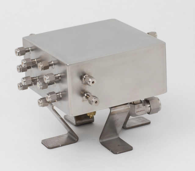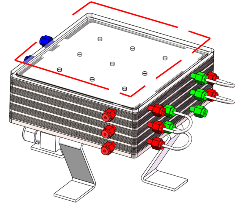 SSC-FMRP微通道连续流反应器,应用了自主开发的流道设计,将传统独立的单板微通道反应器模块,加工压缩成一体,将5个单板持液量10ml的微通道反应器叠加整合为一体,每层反应通道均为两进一出,可根据具体实验设计灵活选择反应的进出口,进而实现反应停留时间的改变和多股进料的需求,并实现了在线温度控制与监测。